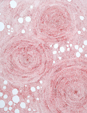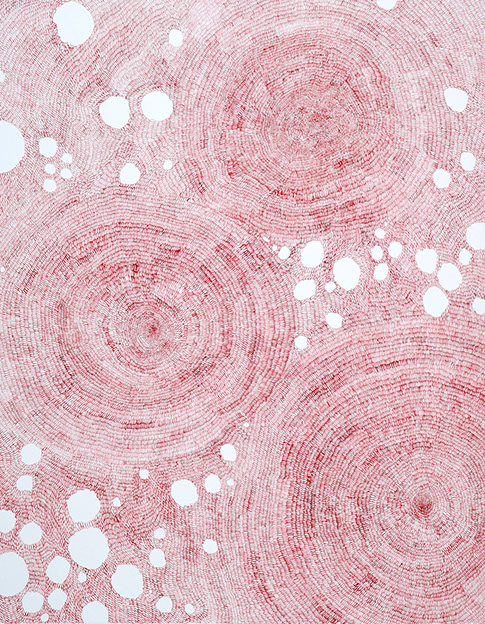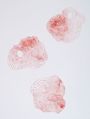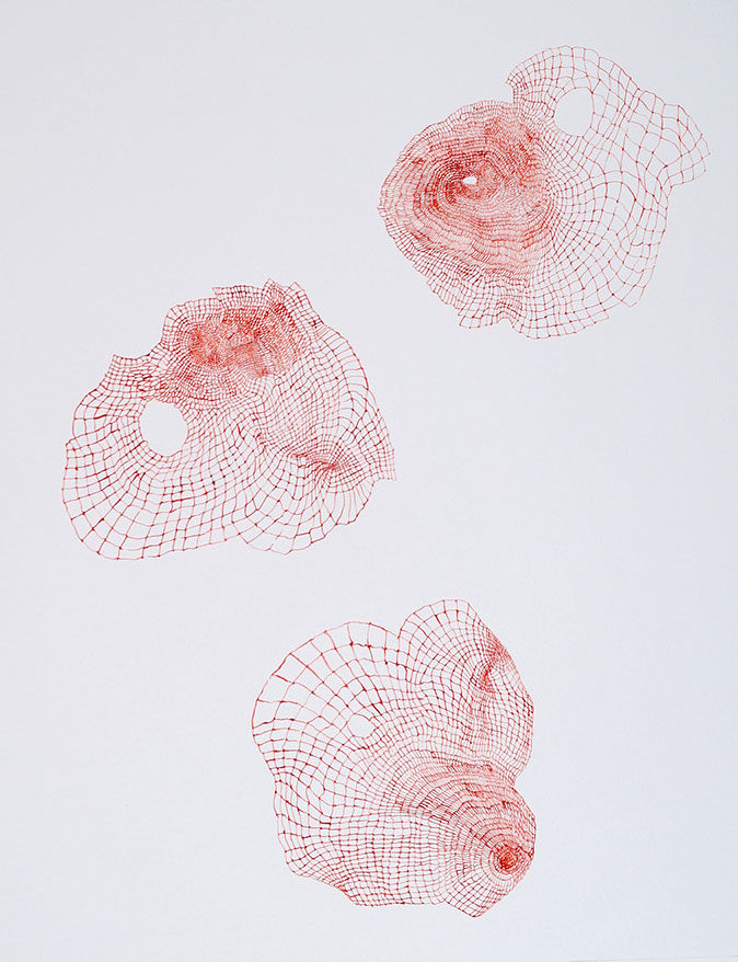 Tissages spatio-temporels est une série qui expérimente le rapport de l'espace au temps. Optiquement, puisque des trames différentes provoquent un effet mouvant de par le rythme changeant imprimé par le geste. Il s'agit aussi d'une expérience corporelle de mesure de cet espace-temps, du temps infini qu'il faut pour avancer, lentement, patiemment, et tisser la toile.