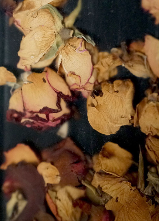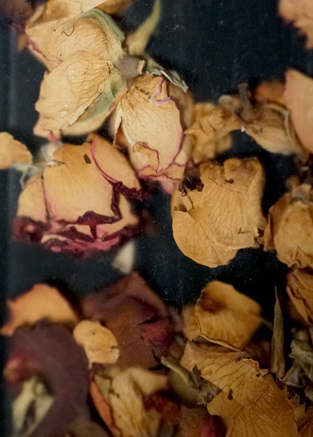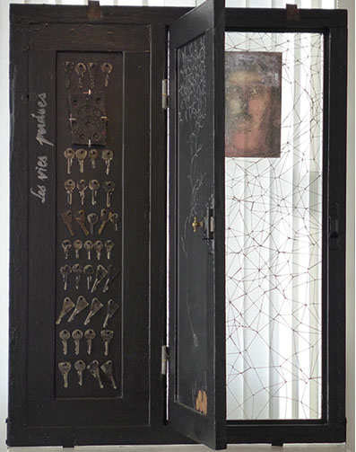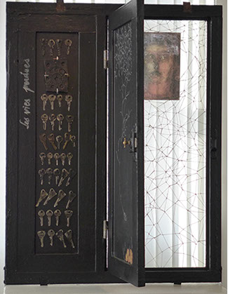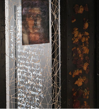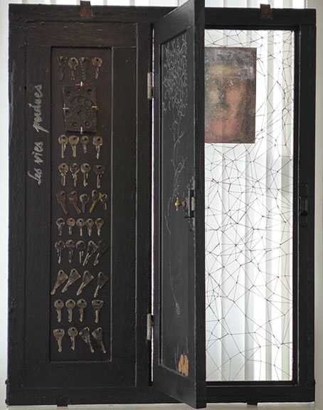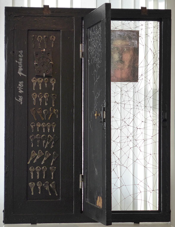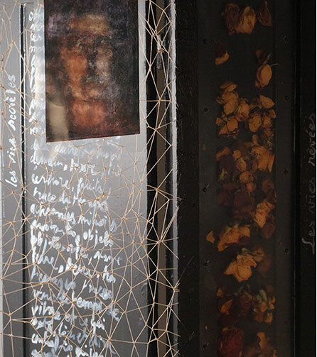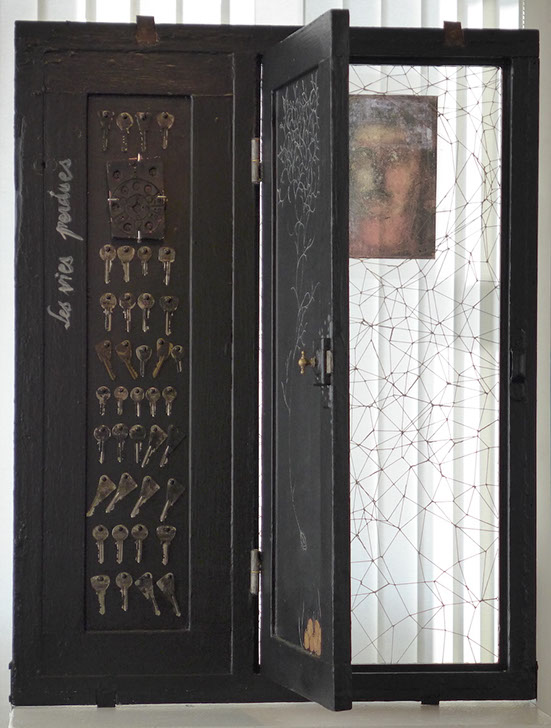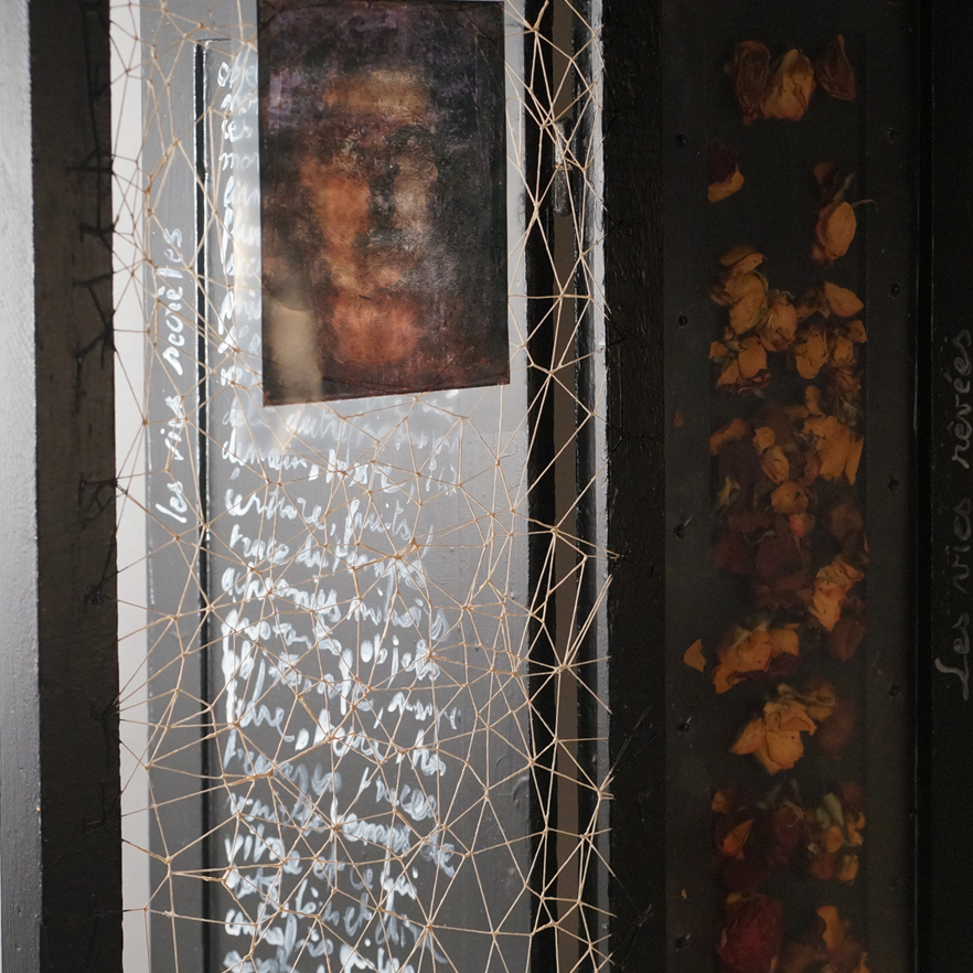Les trois éléments que sont les vies rêvées, les vies passées, les vies perdues, inscriptions peintes en blanc sur les différentes faces viennent rappeler les strates de nos vies. Des clefs, un « fantôme », des fleurs séchées sont autant d’indices intimement liés au passé.