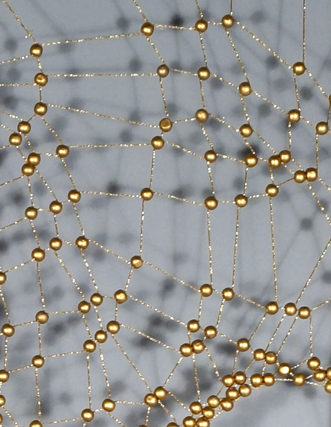 Le travail de la tisserande est représenté par sept métiers à tisser et sept tissages composés de fils et de perles de différentes matières et couleurs qui s’entremêlent comme autant de points et de lignes suggestives d’un univers féminin. À droite les sept coupelles remplies de terres rouges servant aux rituels de lavage des mains des tisserandes.